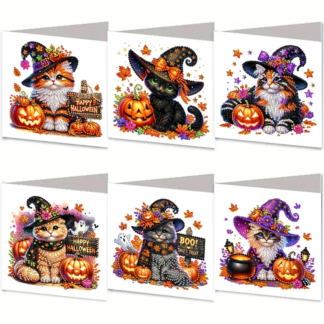 (US Only)6PCS DIY Halloween Cat Diamond Art Greeting Cards for Halloween and Holidays